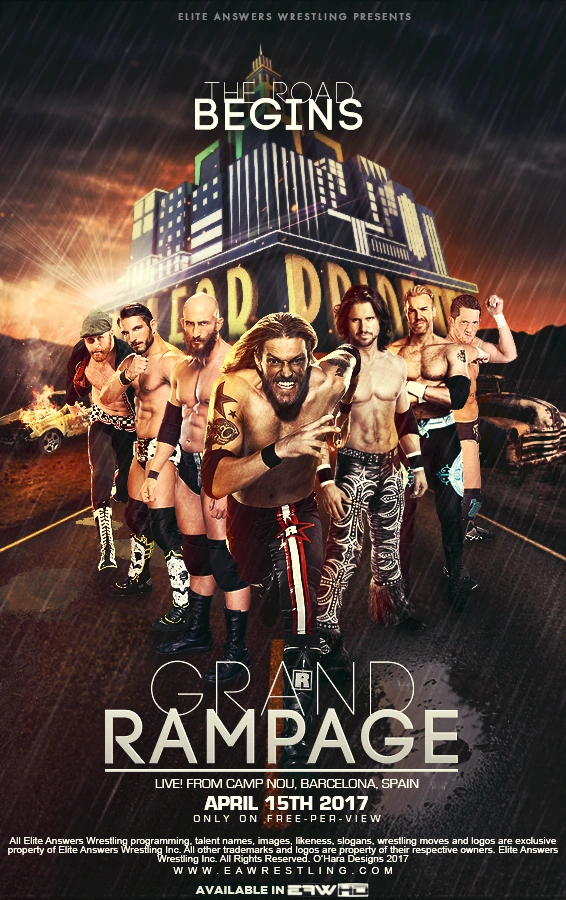 As it is an annual tradition, the 30-Man Grand Rampage match headlines each Grand Rampage event. Elitists enter in the match at a random interval in the order of the numbers they draw. The only way to be eliminated is still by being tossed over the top rope and both feet touching the floor. Some competitors are able to enter the match through qualifier matches and others are placed in by lottery or by management. At Reckless Wiring, Moongoose McQueen lost his match with TLA and was given the first entry in the Grand Rampage Match. On Showdown, Lars Grier, Tiberius IV, Rex McAllister, and The Pizza Boy were all announced to be a part of the Grand Rampage Match. On another episode of Dynasty, Sebastian Monroe would host a Grand Rampage Lottery to see who would be allowed to enter the match. While Ross Vegas and The Riddler were denied, Lucas Johnson, TLA, Kelly Hackenschmidt, Finnegan Wakefield, and El Ironico were all able to secure entry into the Grand Rampage Match. On the April 1st edition of Showdown, Damien Murrow would announce that Nobi, Stark, Ryan Marx and Matt Ryder would be inserted into the Grand Rampage Match. On the final episode of Dynasty before the event, Mark Michaels and Sheridan Müller were announced to be a part of the Grand Rampage Match. On the final episode of Showdown before Grand Rampage, Ryan Marx won a 7-man battle royal to determine the Number #30 spot in the Grand Rampage match, thus making him the Number #30 entrant. The rest of the participants were announced on the EAW website.