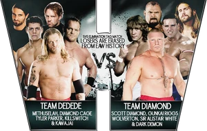 | 8 | Team DEDEDE (Methuselah, Diamond Cage, Tyler Parker, Killswitch, & Kawajai) defeated Team Diamond (Scott Diamond, Gunkai Riggs, Wolverton, Sir Alistair White, & Dark Demon) | 5 vs 5 Falls Count Anywhere, Elimination Styled Extreme Rules Match; Team Diamond are erased from EAW History |